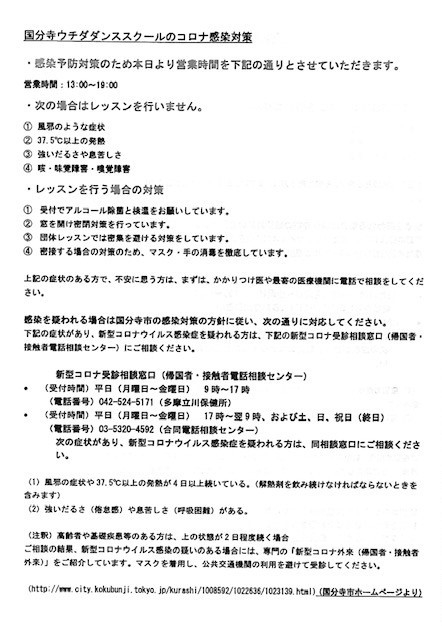 また、当教室は東京都と国分寺市の感染対策の方針に沿った当教室の対応マニュアルに従い対応させていただきます。